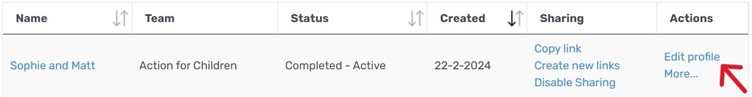In the “Profiles” tab, search for the carer(s) profile. In the “Actions” column, click on “Edit profile”.